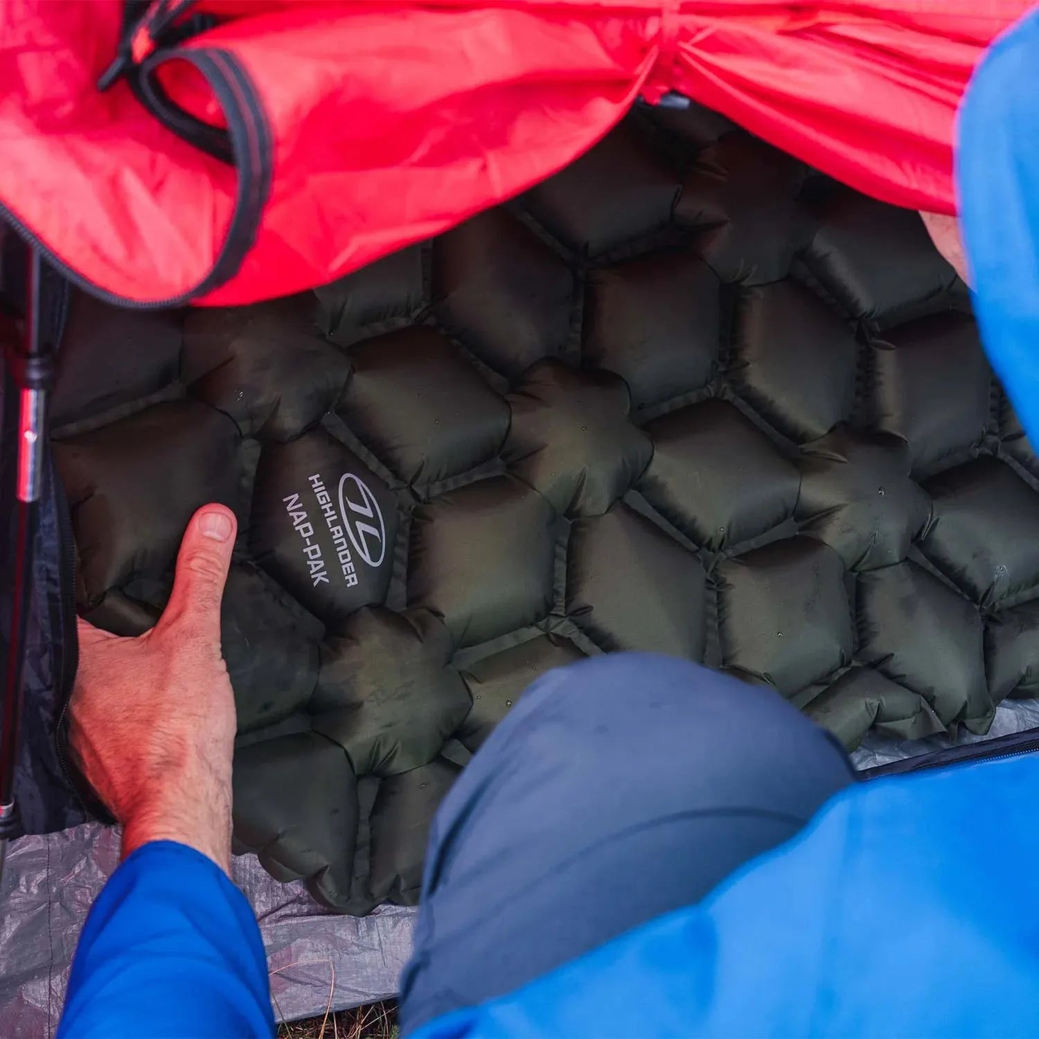 Highlander Nap Pak Inflatable Sleeping. Stay warm by reducing heat loss between your body and the ground and get a great night’s sleep with the NAP-PAK inflatable sleeping mat.