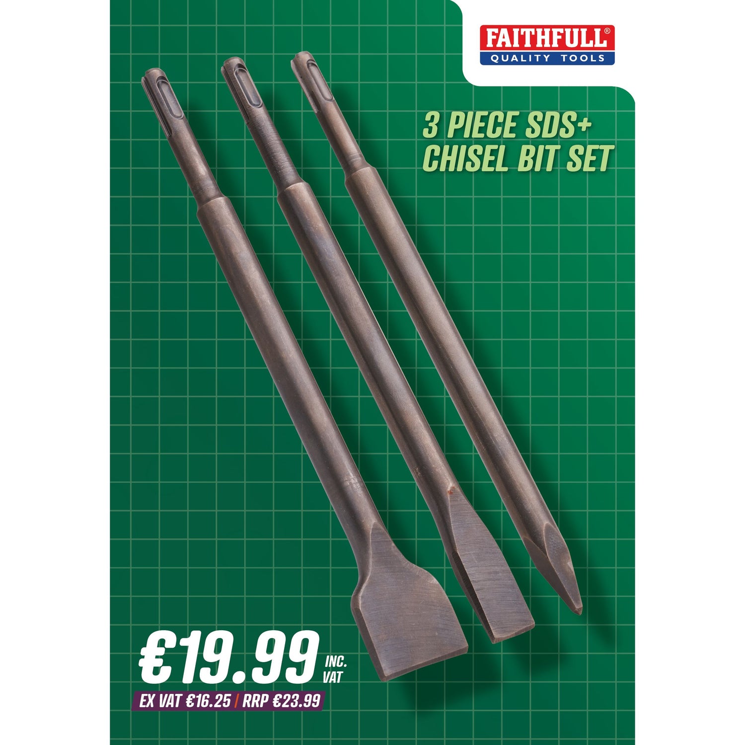This XMS SDS Plus Chisel 3 Piece Set, made by Faithfull, for demolition and break-through tasks in concrete and masonry, a GKO deal not to be messed with.