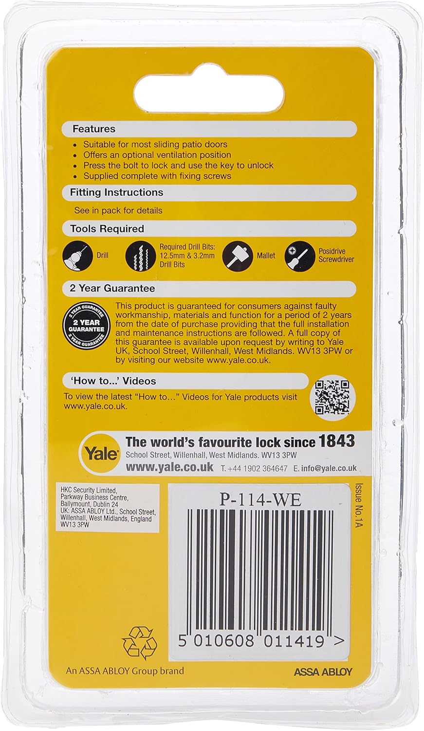 The Yale P114 Patio Door Lock is suitable for most sliding patio doors. This product offers an added layer of security to your home. It also provides an optional ventilation position. Press the bolt to lock and use the key to unlock. Easy fitting instructions are included to allow seamless installation.